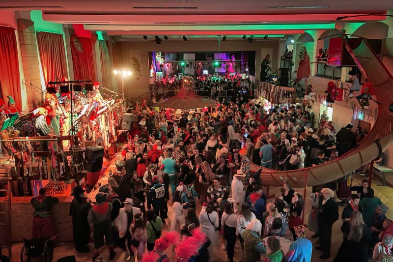 Nichts wurde dem Zufall überlassen und alle fieberten dem Fasnachtssamstag entgegen. Um 19.00 Uhr war es dann soweit, die Türen der Löffinger Festhalle öffneten sich und eine große Narrenschar aus Löffingen und Umgebung gab sich ein buntes närrisches Stelldichein. Innerhalb kürzester Zeit war die Halle bis auf den letzten Platz gefüllt und den Verantwortlichen standen die Freudentränen in den Augen. Zum Auftakt wurde die Walpurgisnacht aufgeführt, die mit viel Beifall aufgenommen wurde. Zwei Tanzmusikabteilungen unserer Löffinger Stadtmusik spielten nach der närrischen Ansprache von Narrenvater Alfred Köpfler unermüdlich zum Tanz auf. An der Rutsche musste man bald Schlange stehen und der Saal brodelte in kürzester Zeit. Für das leibliche Wohl war mit einer Hexenküche und verschiedenen Ausschankbereichen bestens gesorgt, so dass niemand über Hunger oder Durst klagen konnte. Daran hat sich bis heute nichts geändert.