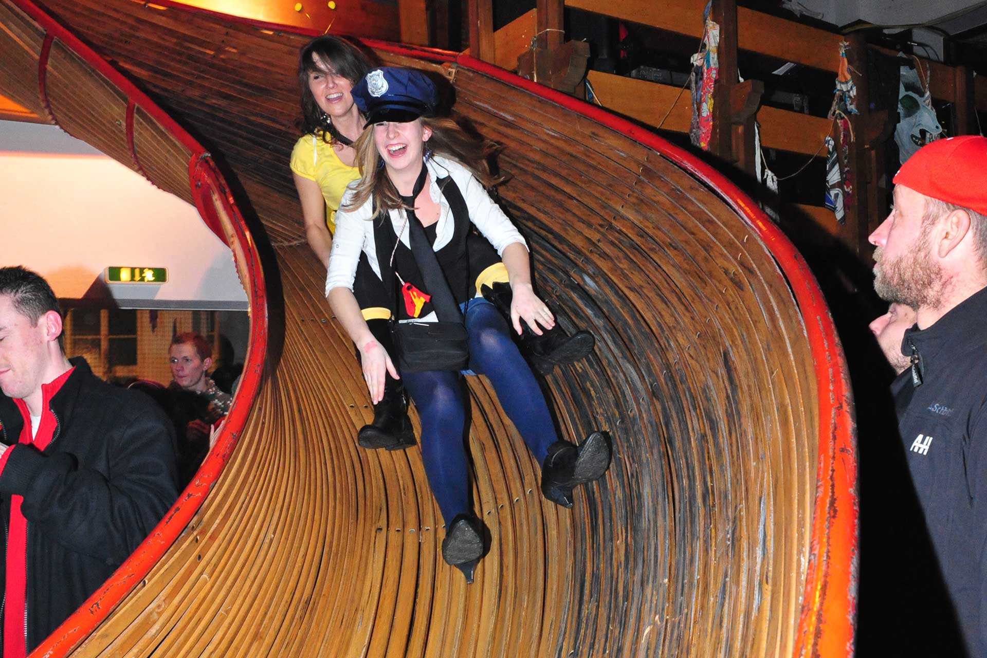 Doch was sollte die Attraktion sein? Hier waren die Ideengeber gefragt. Noch am selben Abend wurde beschlossen, als besondere Attraktion eine große Hexenrutsche zu bauen, die von der Empore der Festhalle hinunter in den Saal führen sollte. Pläne wurden gezeichnet, Materialspenden gesammelt und los ging’s. Viele der Hexen waren damals, so wie heute, im Handwerk oder der Landwirtschaft tätig, sodass das Großprojekt in unzähligen Arbeitsstunden umgesetzt werden konnte. Beim 1. Hexenball am 11. Februar 1961 wurde die Hexenrutsche mit viel Tamtam in Betrieb genommen und ist bis heute eine der Attraktionen bei unseren Gästen.